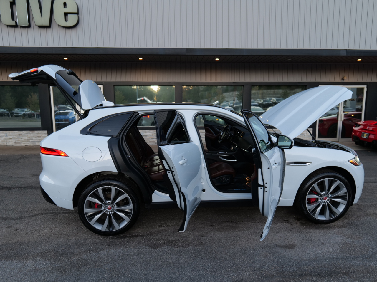 On the exterior, it showcases 20-inch split 10-spoke alloy wheels with red Jaguar brake calipers, an aggressive front bumper design, and LED headlights.
