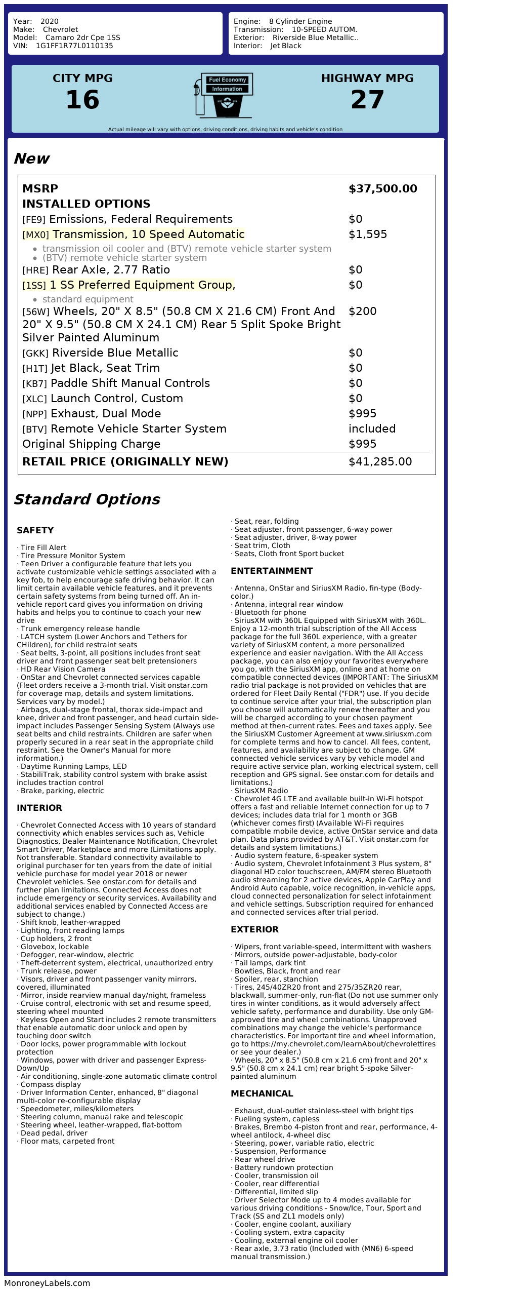 2020 Chevrolet Camaro 2dr Cpe 1SS