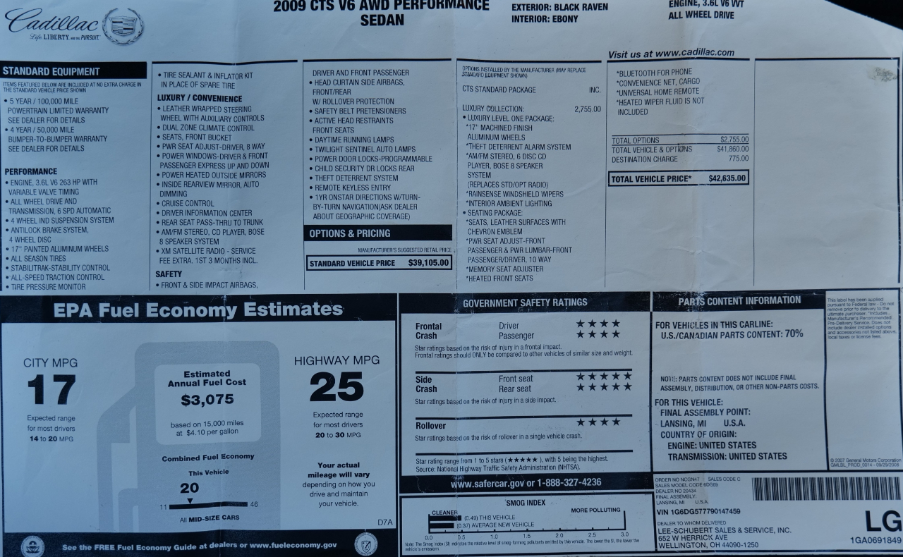 2009 Cadillac CTS 4dr Sdn AWD w/1SA
